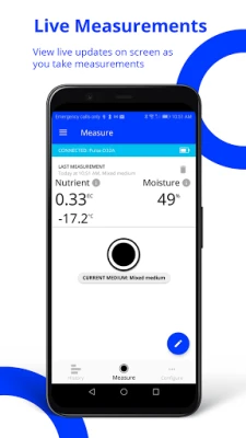 • VIEW MEASUREMENTS: View live updates on screen as you take measurements with the Pulse Meter. Take measurements from the button on Pulse Meter, or in the app. A single button press or tap gives you pore conductivity (nutrient EC), % moisture content (volumetric or % of max water holding capacity), and temperature.